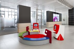 Das erste Obergeschoss enthält den neuen Vorstandsbereich, zugehörige Büro- und Besprechungsflächen sowie einen Loungebereich.
